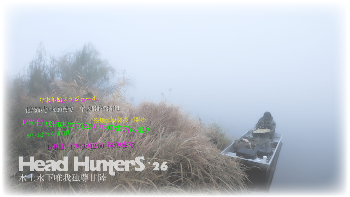 釣り。何でこんなにも楽しくドラマチックなのでしょう。 何で僕らは釣るのでしょう。 それぞれの生き様にそれぞれの釣り様。 それぞれの遊びのスパイスに ヘッドハンターズはなれれば良いな。 と思っております。 ヒゲでモヒカンな怪しい僕がお店に立っています。 気になること、何でもお気軽にお声をかけてくださいませ。 また、こちらから何か話しかける事も多々あります。 優しく接してあげて下さい。喜びます。 噛みません。 夜水を与えないで下さい。 化けます。
