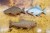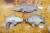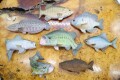 ブローチ 上段、魚本来の色 ライギョ(左向き)27500円(税込)、下段左から、魚本来の色 ジャンピングシーバス(右向き)27500円(税込)、魚本来の色 ブルーギル(左向き)27500円(税込)