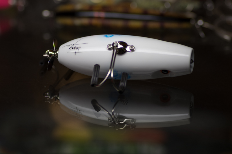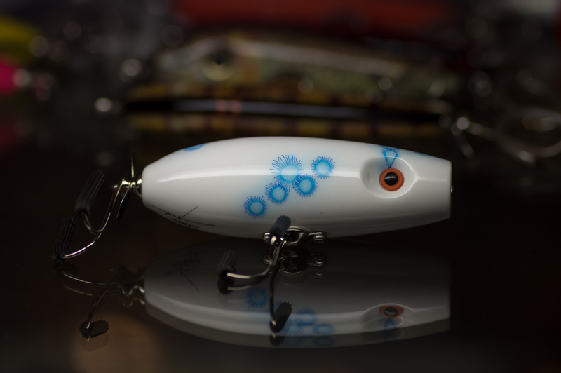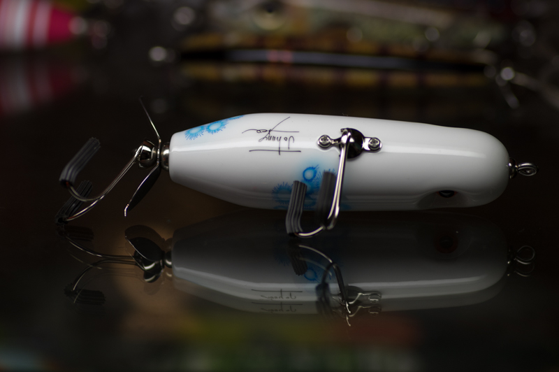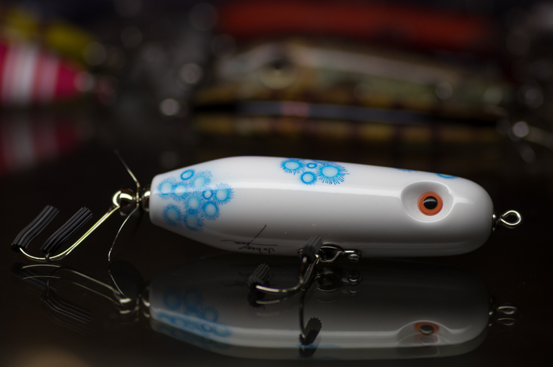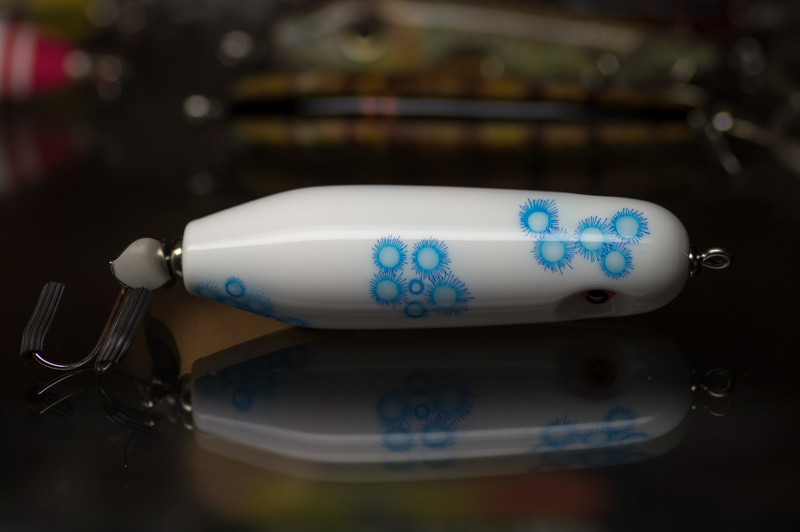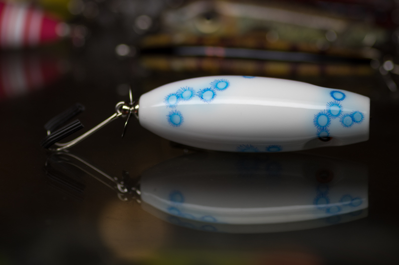 青いミルククラウン柄が不規則正しく配置された、いわゆるカビカラー。ミルククラウンとは牛乳などの若干の粘性を持つ液体において、その液体を薄く塗った平たい容器にその液体を一滴落とすと、美しい王冠状の形を形成する現象。ボディに一滴青い塗料を垂らし、そこにエアガンスプレーで空気だけをシュッと吹くと、風圧で一滴の塗料が周囲に飛び散り、結果ミルククラウン柄となるとか。この飛び散った細かい柄により、遠目で見ると、グラデーションの効いた柔らかいスポット柄に。光量の低い曇りの日やマズメ時、ルアーのコントラストが軽減され、まるでソフトプラスチックワームの様な柔らかさを感じるから不思議で魅了される。Jhonny the Aceルアーが躍動している、あの映画のような素敵な場面、HeadHuntersが感動しているあのシーンを、是非共有して頂ければ、と思い定期的に別注ペイント頂く、HeadHunters王道別注色の一角