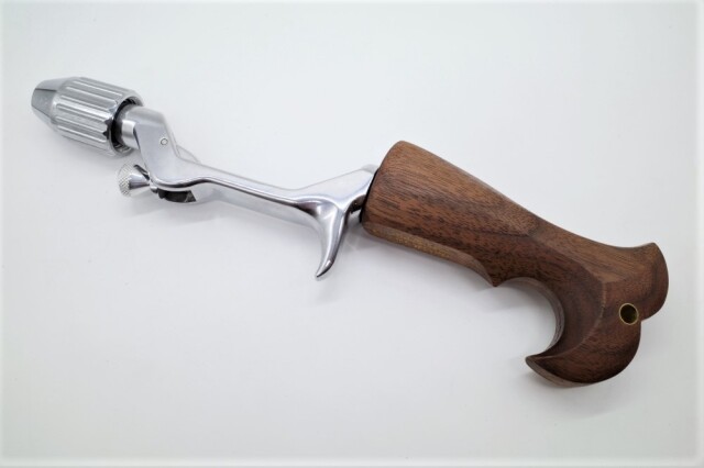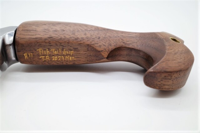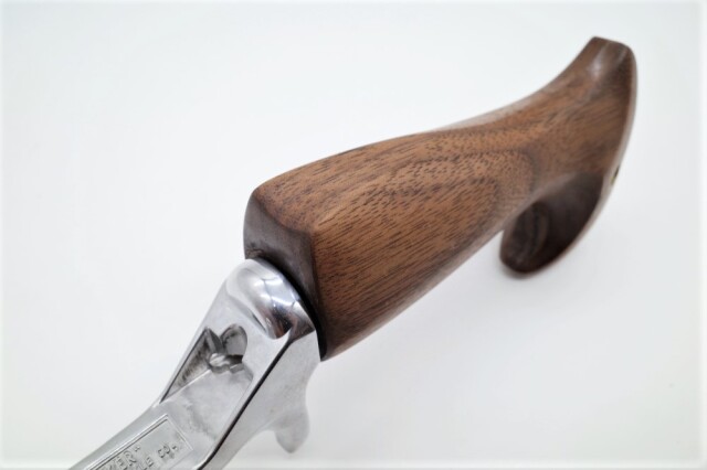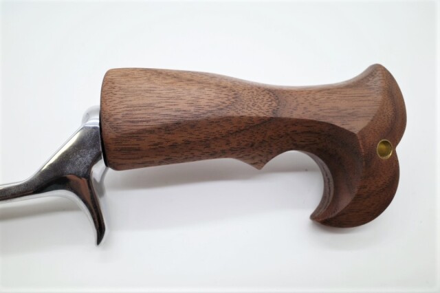 シルバーアクセサリー職人で専門学校で教師も務めるE-No Produtsの技巧が細部に渡り炸裂したグリップ。ウォールナット仕様。