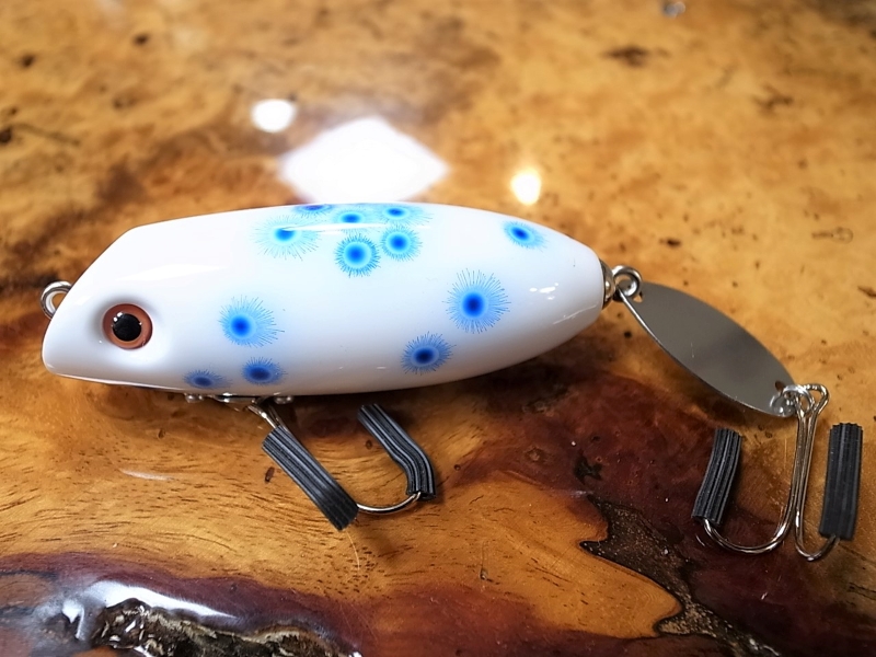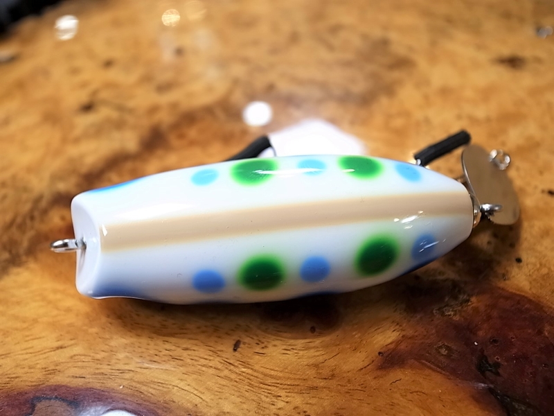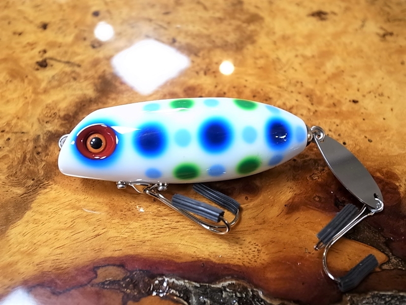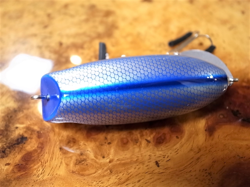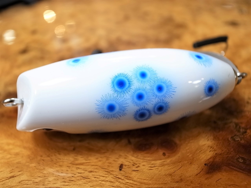 青いミルククラウン柄が不規則正しく配置された、いわゆるカビカラー。ミルククラウンとは牛乳などの若干の粘性を持つ液体において、その液体を薄く塗った平たい容器にその液体を一滴落とすと、美しい王冠状の形を形成する現象。ボディに一滴青い塗料を垂らし、そこにエアガンスプレーで空気だけをシュッと吹くと、風圧で一滴の塗料が周囲に飛び散り、結果ミルククラウン柄となるとか。この飛び散った細かい柄により、遠目で見ると、グラデーションの効いた柔らかいスポット柄に。光量の低い曇りの日やマズメ時、ルアーのコントラストが軽減され、まるでソフトプラスチックワームの様な柔らかさを感じるから不思議で魅了される。Jhonny the Aceルアーが躍動している、あの映画のような素敵な場面、HeadHuntersが感動しているあのシーンを、是非共有して頂ければ、と思い定期的に別注ペイント頂く、HeadHunters王道別注色の一角