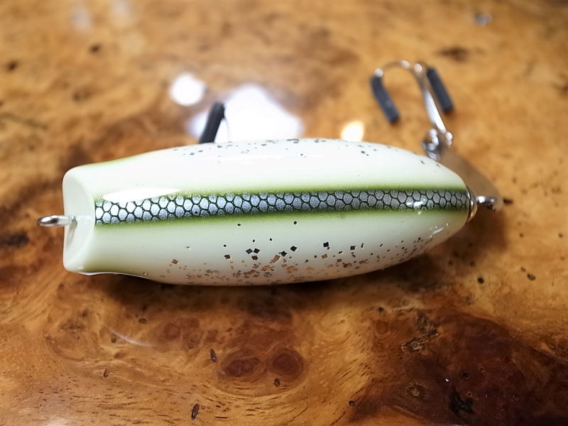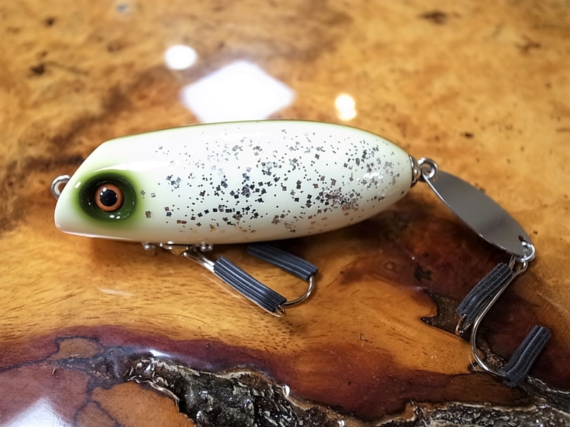 北米のコイ科の多数の小さい銀色の魚、それがシルバーシャイナー。日本で云うところの、雑魚(ザコ、ザッコ)のアメリカ版表現。日本人は性格上、デフォルメ表現が苦手で、何でもリアルに緻密に表現してしまいますが、アメリカ人はこんな柄で、雑魚を表現しています。アイボリーとオリーブグリーンの組み合わせ、カーゴパンツ+ヘンリーネックの様なミリタリーな配色に強烈にアメリカを感じます。で、背中のオリーブにビシッとメイドインジャパンクォリティで塗り込まれた細いパールシルバースケールと、あえてチープに乱雑に横腹に散りばめられた銀ラメ、シルバーグリッターとの対比がドンブリ一杯いけますネ。スケールもグリッターも光をアイボリーベースボディの上で白っぽく反射します。アイボリー×銀ピカが本当にビックリする程にシャイナー、雑魚に見えたあの瞬間にアメリカ人の狩猟民族の創造性を感じます。Jhonny the Aceルアーが躍動している、あの映画のような素敵な場面、HeadHuntersが感動しているあのシーンを、是非共有して頂ければ、と思い定期的に別注ペイント頂く、HeadHunters王道別注色の一角