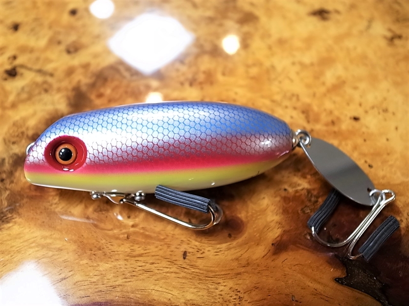 アメリカ発祥の虹色、ヴィンテージルアーでは定番のレインボーカラーリングにHeadz別注依頼ペイント。あ、私、虹色のルアーでどす黒いブラックバスと云う魚を釣っています。効果云々の前に、虹色のルアーでバスを釣ると云う行為が素敵で洒落ていると思いませんか?虹色と言っても7色表現では無く、赤と青を中心とした、アメリカンフラッグ配色な処も見逃してはいけません。そしてJohnny the Aceのテクニックがキレる鋭いシャープなパールシルバースケール、ベリーのアイボリーとの色調変化。これはフィールドでルアーアクション中に観察いただかないと伝わりませんが、釣り場でこのレインボーカラーのJhonny the Aceルアーが躍動している、あの映画のような素敵な場面、HeadHuntersが感動しているあのシーンを、是非共有して頂ければ、と思い定期的に別注ペイント頂く、HeadHunters王道別注色の一角